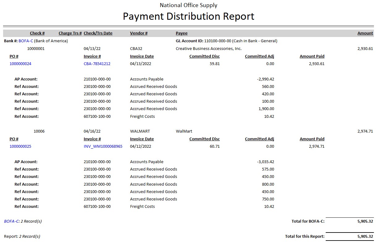 ![]() Payment Distribution Report The Payment Distribution Report provides information on how much of a check amount is paid to a particular invoice or invoices. The report shows information such as the invoice details, the PO# associated with the AP invoice (if any) and the checks’ GL distribution. This report is useful in reviewing the invoices for which the checks are issued and the GL Account IDs to which the check payments are posted. You can select to generate the report for printed checks only, handwritten checks only, electronic