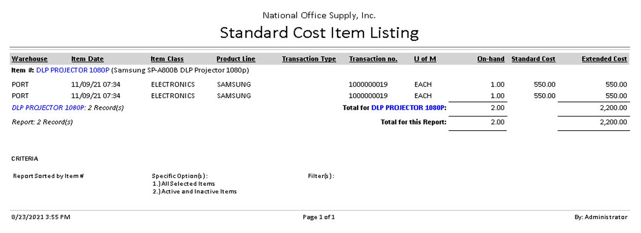 ![]() Standard Cost Item Listing The Standard Cost Item Listing provides information on inventory items that are assigned with the Standard Cost costing method. The report shows the unit cost and on-hand quantities of each standard cost inventory item. The report is useful for reviewing the costs and quantities of inventory items using the Standard Cost inventory valuation. You can select to generate this report only for items used in invoices/sales orders, only for items used in purchase orders, only for items used in work orders, or all items that meet the specified criteria. You can further opt to generate this report only for the active items, only for the inactive items, or all items regardless of status.