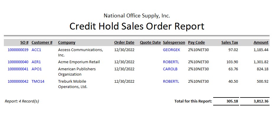 ![]() Credit Hold Sales Order Report AccountMate Enterprise allows you to put on credit hold a sales order for a customer who exceeds the credit limit at the time the sales order is created. The Credit Hold Sales Order Report provides a list of sales orders that are put on credit hold. This report is useful in identifying and monitoring sales orders that are yet to be released from credit hold. You can generate this report to show multi-currencies.