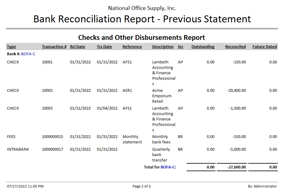Checks and Other Disbursements Report This report shows details of all previously reconciled checks and other disbursement transactions included in