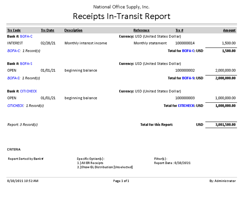 ![]() Receipts In-Transit Report The Receipts In-Transit Report provides detailed information about receipt transactions recorded in the Bank Reconciliation (BR) module that are neither marked as cleared nor received in the bank as of a specified Report Date. The report shows BR receipts that are “in-transit” to the bank based on the date specified in the Report Date field of the report criteria. This report includes information such as the transaction code, transaction date, description, transaction #, bank account and receipt amount. You can generate this report to help you verify and monitor your bank’s cash balance as of the specified report date to effectively manage your cash transactions. This report also serves as a guide in reconciling receipts. You can generate this report for individual bank accounts or you can generate the report to show all or a range of bank accounts. You can opt to include all or a range of transaction codes, specify a transaction date range or entry date range. You must specify a Report Date to generate the report successfully. You can further filter the report to show only interests earned, other BR receipts only, or all BR receipts. You can also select to show the GL distribution in this report.