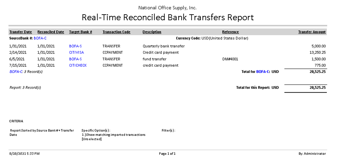 ![]() Real-Time Reconciled Bank Transfers Report The Real-Time Reconciled Bank Transfers Report provides detailed information on all bank transfer transactions marked in AccountMate as having cleared the bank. The report displays all the reconciled bank transfers in the system regardless of the date the report was generated. The report includes information such as source bank #, target bank #, transfer date, currency, transfer amount and the date it was marked as reconciled. The report is useful for verifying that reconciled bank transfers are authorized and can be used as reference in reconciling bank transfer transactions. You can generate this report for an individual source bank account. You can also opt to generate this report either for all or a range of source bank account, all or a range of target bank accounts, and all or a range of transaction codes. You can further filter the report by specifying the transfer date or the reconciled date, and either to show or not to show matching imported bank transfer transactions.