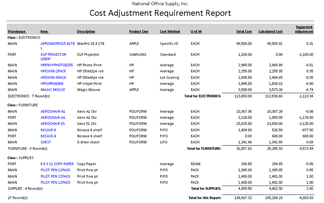 ![]() Cost Adjustment Requirement Report The Cost Adjustment Requirement Report provides information on inventory items whose costs are out of balance due to rounding variances. This report displays the inventory item’s total cost, system-calculated cost and a suggested adjustment amount to reconcile the total cost and the system-calculated cost. This report is useful in evaluating any discrepancies in the inventory item costs. You can use this report as a reference when posting inventory adjustments.