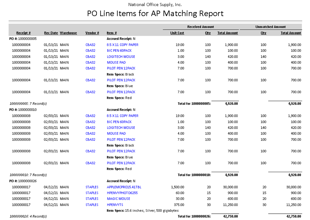 ![]() PO Line Items for AP Matching Report The PO Line Items for AP Matching Report provides detailed information on the PO receipts that are yet to be matched to AP invoices. These PO line items are received from vendors whose records are set up to use the AP/PO Matching feature. You can use this report to determine the quantity and amount of PO receipts for which no AP invoices are posted. It also serves as reference when reconciling the received goods liability account balance in the General Ledger. You can opt to include in the report the PO receipts that are fully matched to AP invoices. You also have the option to show the reference GL Account IDs and multi-currencies. The report can be filtered to show only accrued PO receipts, only PO receipts that are not accrued, or both.