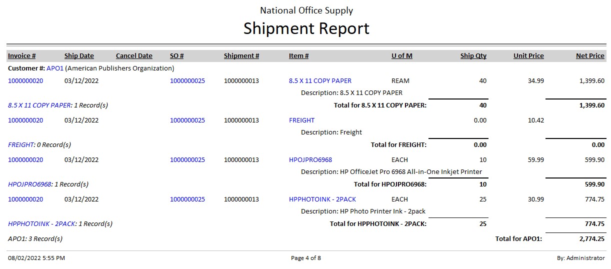 inventory type. You can further filter the report only for shipments with invoices, only for shipments without