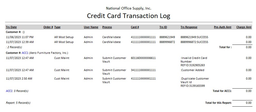 The Credit Card Processing Reports provide information on a range of credit card activities that occured when the Credit Card Processing feature is activated. It also provides information on credit card pre-authorization status. These reports helps you focus on transactions using credit card processing. Each of the Credit Card Processing Reports is especially designed with options you can choose that narrows down data to the specific information you need. Read the information below to get a closer look at each of the Credit Card Processing Reports available in AccountMate Enterprise. Credit Card Transaction Log The Credit Card Transaction Log lists the credit card transaction details. The credit card transaction details in this report must match the Settlement Report from your provider and your Cash Receipts Report for the payments assigned with the pay codes set for use in credit card processing. This report helps you track and review the details of a specific credit card transaction, track the details of each user who recorded the credit card transactions, and use it as a reference for daily reconciliation of credit card transactions. You can choose to include in this report various kinds of transactions involving sales, verification, refunds, voiding, pre-authorization, and/or credit as well as customer card activities and/or certain credit cards--Visa, MasterCard, American Express, and Discover. If you chose to sort the report by User, you may opt to include in the report the user details. You may also show the complete transaction response. You can also choose to include in the report only the transactions that were successfully processed, only the transactions that failed during processing, or all transactions that meet the chosen criteria.