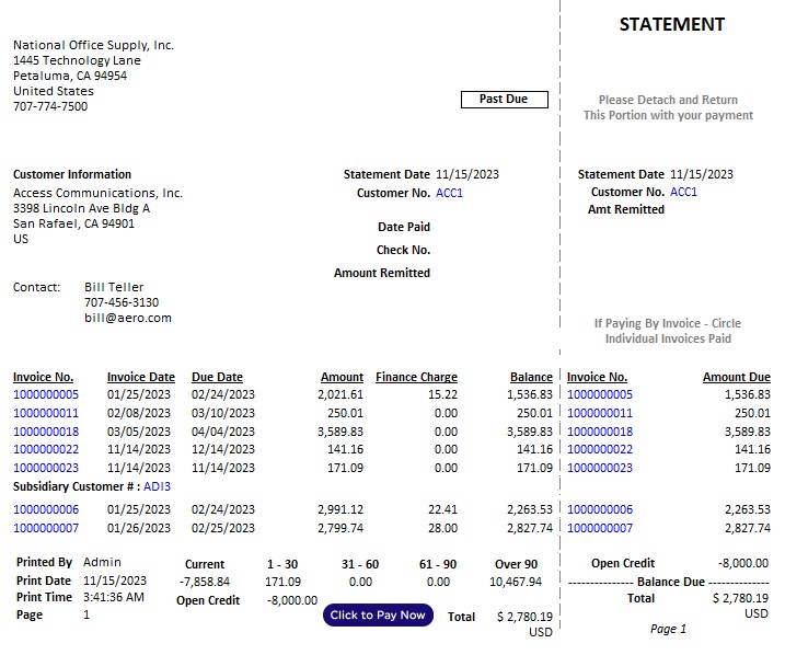 Customer Statements serve as billing documents sent to customers to demand payment on invoices that are due. You can print customer statements using the Print Customer Statement function. Each Customer Statement lists the invoices, customer payments, open credits, finance charges applied to invoices, and total receivable balance as of the statement date. A detachable stub at the right portion of the document is available which the customer can use and return with the payment. In the Print Customer Statement function, you can specify the last statement cut-off date and the current statement cut-off date. You have the option to choose whether to age the invoices based on invoice due date or invoice date. You can opt to print statements only for customers whose invoices are past due for more than the specified number of days from either the invoice date or due date up to the statement cut-off date. This enables you to mass print Customer Statements for the past due accounts. You may also choose to include fully paid invoices in the statement, print statements even for customers with zero outstanding balances, and print each subsidiary’s account on a new page. You can elect to suppress the document labels’ background color and to consolidate the statement for the parent account and its designated subsidiaries.
