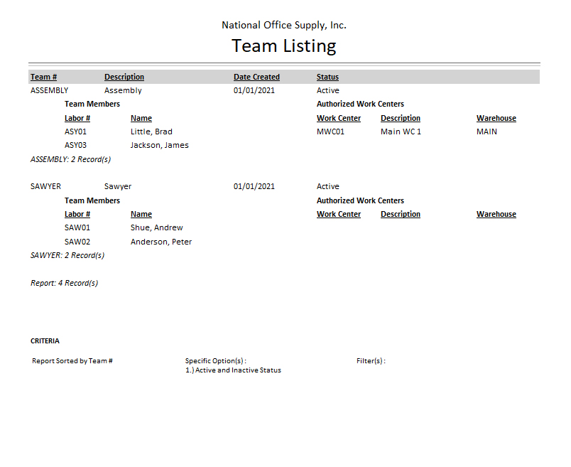 ![]() Team Listing AccountMate Enterprise provides you the ability to group together labor records into teams using the Team Maintenance function. The Team Listing is a report that provides information on the team records maintained in the system. The report shows details such as team code, the respective labor codes of team members, work centers and warehoused assigned to a team. You can use the report in reviewing and monitoring team records maintained in the system. You can generate the report to show only team records with active status, inactive status or all