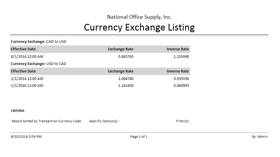 The Currency Exchange Listing shows the current exchange rate and inverse rate of each currency code activated in AccountMate. The report shows the different exchange rate and inverse rate with the effectivity dates if there are multiple rates defined in the currency code record. This report can be used to review the currency exchange rates and serves as reference when creating transactions in different currencies.