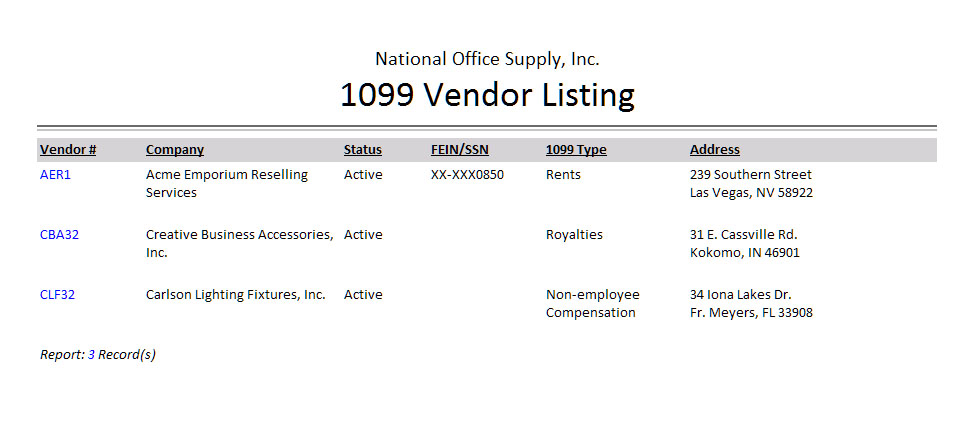 You can generate this listing for active 1099 vendors only, inactive 1099 vendors only, or all 1099 vendors regardless of status. You can also select to show the vendors' addresses.