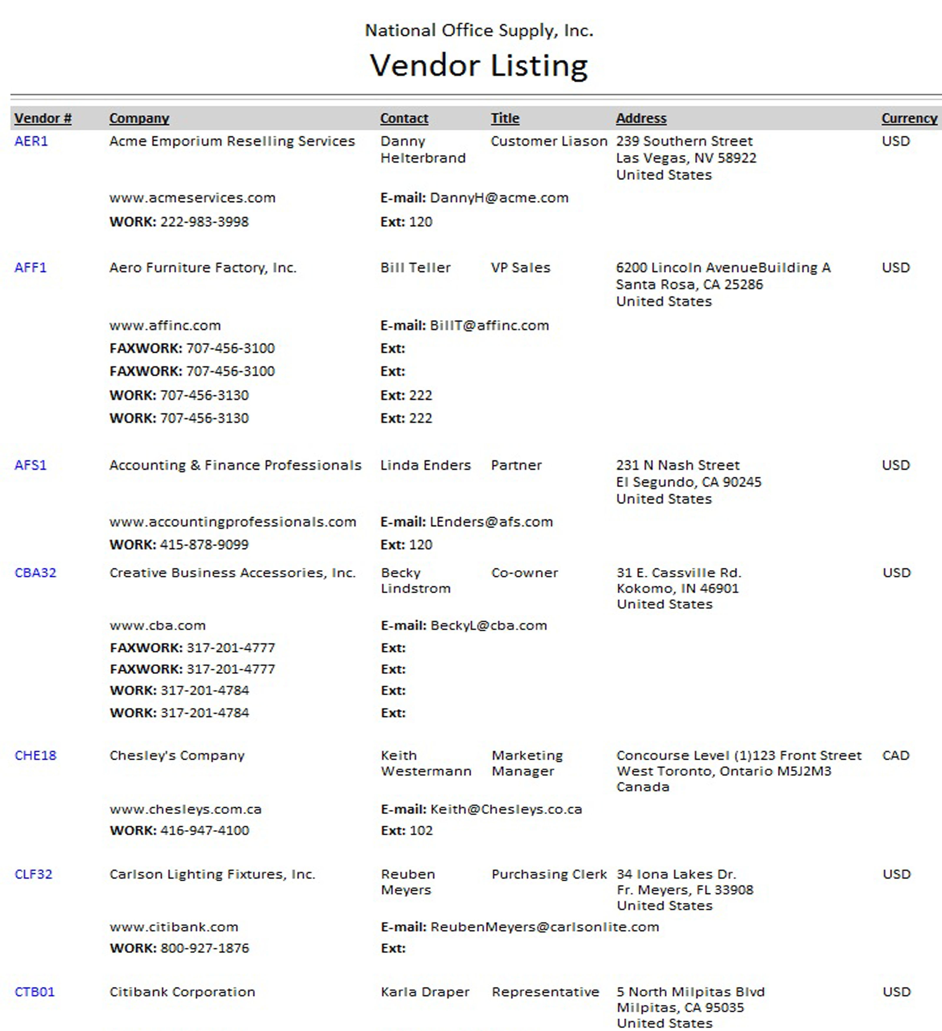 The Vendor Listing is a report that lists all vendor records set up in AccountMate. This report is useful in reviewing detail information about each vendor.