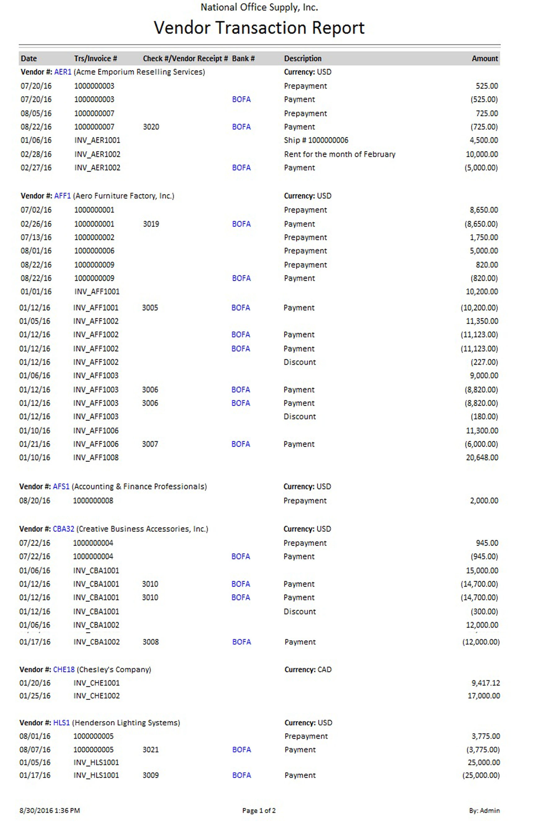 The Vendor Transacton Report provides details of a vendor’s invoice and payment transactions for the period specified in the report criteria. The report shows information such as the transaction date, transaction/invoice #, check #/vendor receipt #, bank code and the transaction amount. This report can be used to verify the transactions recorded for the vendor. It is also useful for tracking the different transactions affecting the vendor’s balances.