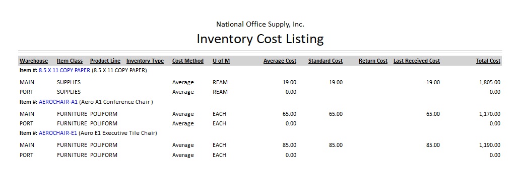 The Inventory Cost Listing provides the inventory items’ cost related information including the unit cost, cost method, average cost, standard cost, return cost, last received cost and total cost. This report is helpful in comparing each inventory item’s various costs.