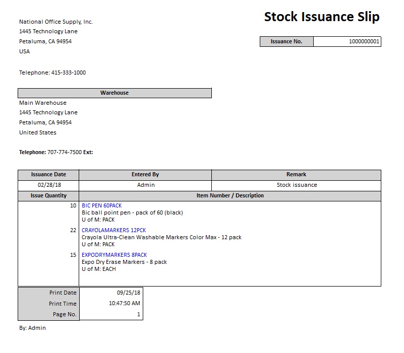 The Print Stock Issuance Slip function allows you to print the internal stock slip(s) for each of the transactions entered in the Internal Stock Issuance function.<
