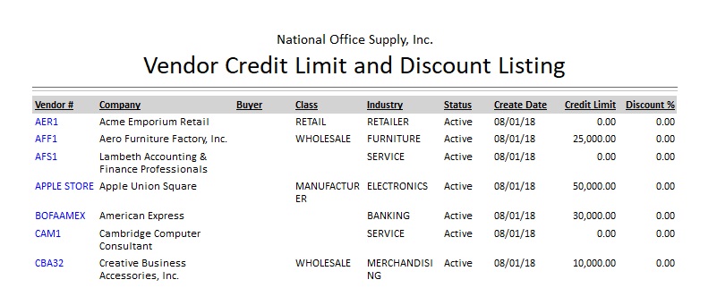 The Vendor Credit Limit and Discount Listing provides information on the vendor’s credit and discount arrangements with your company. In this report you can view the credit limits and discount rates that the vendors grant your company. You can use this report together with the Aging Report to help you analyze your credit standing.