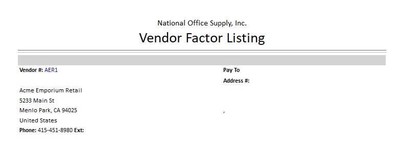 The Vendor Factor Listing provides information about the factors (those who act on the vendor’s behalf) specified in the vendor’s record. Vendor factors are set up in the vendor record’s Settings Page >> Factor (Pay to) field. This report can be used for reviewing information about the factors whom your vendors authorize to collect your payments.