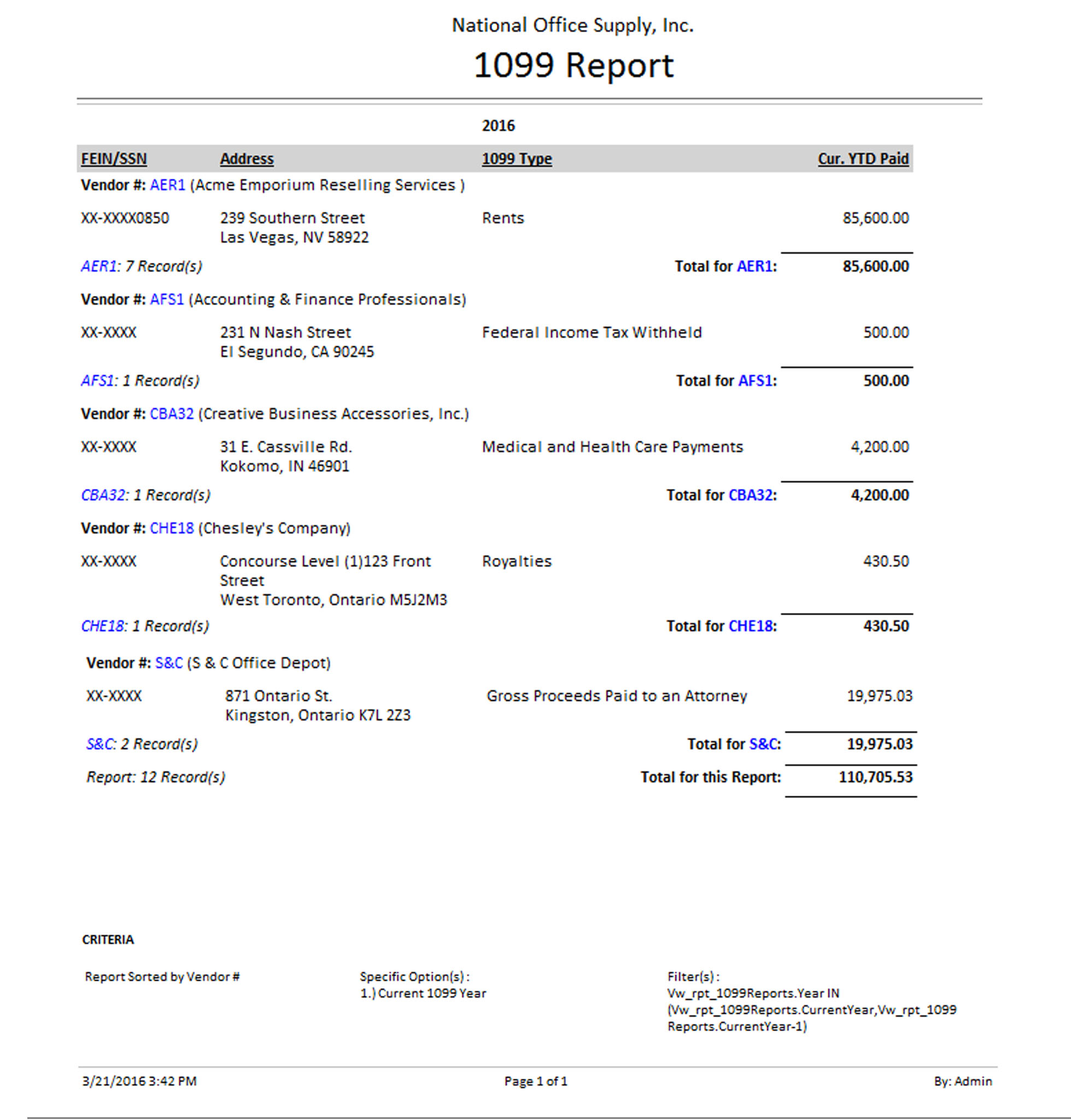 You can generate this listing for active 1099 vendors only, inactive 1099 vendors only, or all 1099 vendors regardless of status. You can also select to show the vendors' addresses.