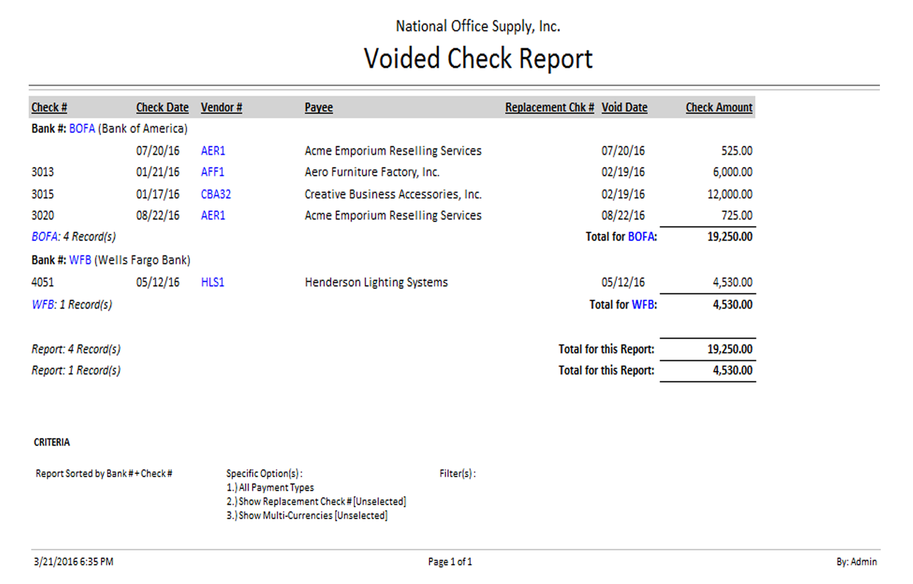 The Voided Check Report provides information on checks and other payment type transactions that are voided in AccountMate. The report shows information such as the check number, check amount, payee, void date and the replacement check # (if a replacement check was issued). You can use this report and the Check Register Report to assess the completeness of the checks recorded in AccountMate. You can also verify whether the checks listed in this report match the actual voided checks in your possession.