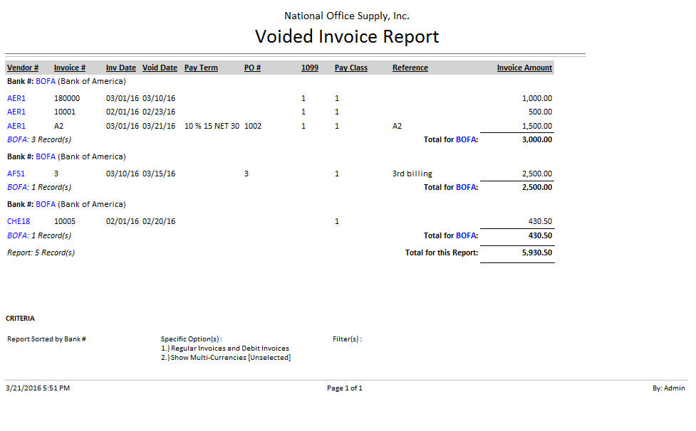 The Voided Invoice Report allows you to view voided AP invoices and information related to the invoice. You can use this report together with the AP Voucher # Report to verify missing voucher numbers, if there are any.
