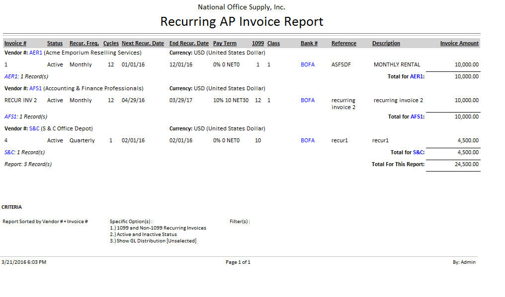 The Recurring AP Invoice Report provides information on the recurring invoice templates that are set up in AccountMate. This report is useful in identifying the vendors for whom these recurring invoice templates are set up and in reviewing the templates' other important details such as the recurring frequency, number of cycles, next recurring date and end recurring date.