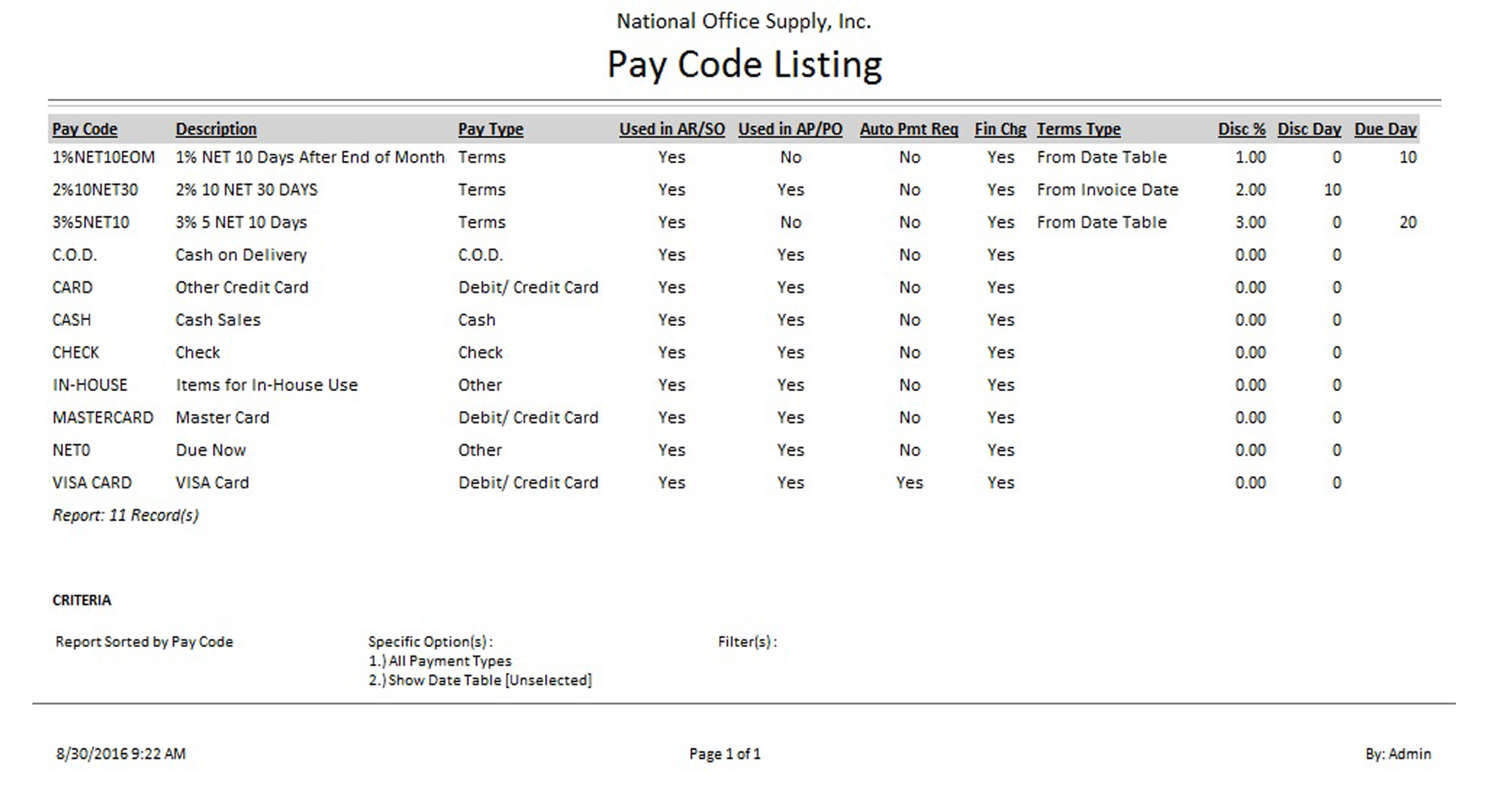 You can generate the report to show any or all of the following pay code types: Cash, Check, debit or credit card, C.O.D., Terms, ACH, and/or Other types. You can also opt to show the Date Table set up for each Terms pay code.