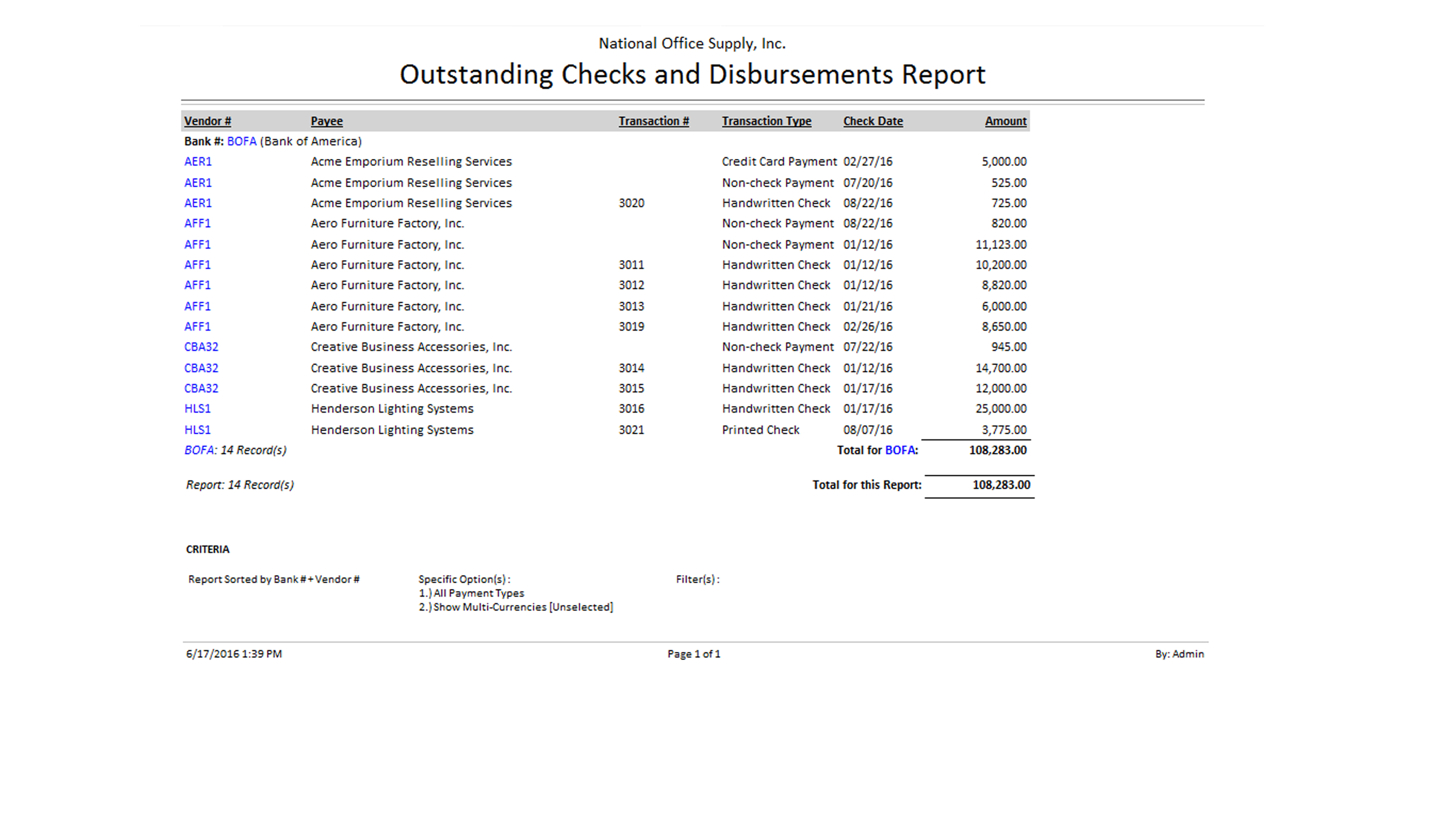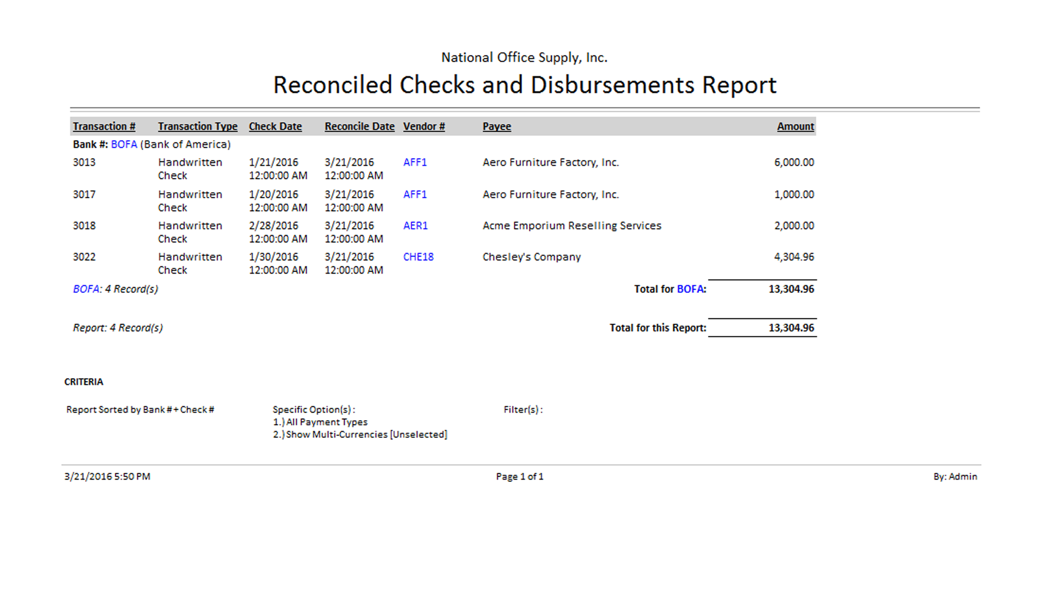 You can select to generate this report to show printed checks only, handwritten checks only, electronic payments only, credit card payments only, non-check payments only, or all payment types. You can also opt to show multi-currencies in the report.