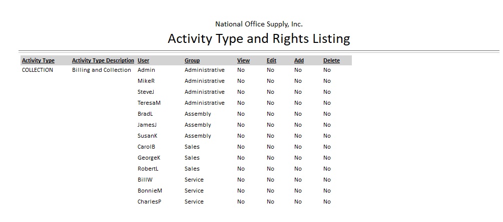 If you want to view the list of activity types and activity rights records set up in AccountMate, generate the Activity Type and Rights Listing. This report provides a quick view of the nature of your company’s activities and processes (i.e., customer complaints, contract negotiation, etc.) during transacting with your customers. This report also helps you identify which users have the rights to view/update a certain activity type.