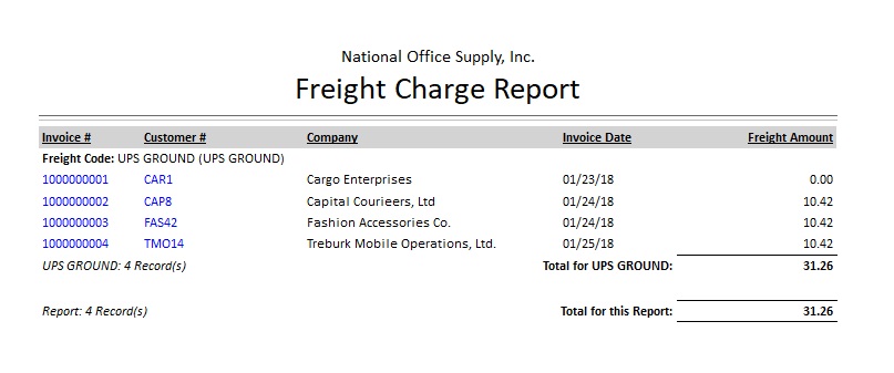 The Freight Charge Report shows detailed information on system-calculated freight charges applied to sales invoices or sales returns. These freight charges are based on the charge rate or amount defined for each freight code. This report is useful in verifying the correctness of the calculated freight charge for each sales invoice or sales return.