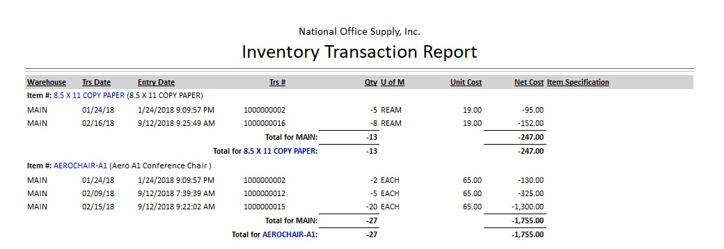 The Inventory Transaction Report provides an analysis of transactions affecting your inventory items. The report shows in detail transaction types that were posted for each inventory item. The report is useful for reviewing and tracking inventory transaction information per transaction type. It can also be used as a reference in analyzing the effects of transactions to your inventory.