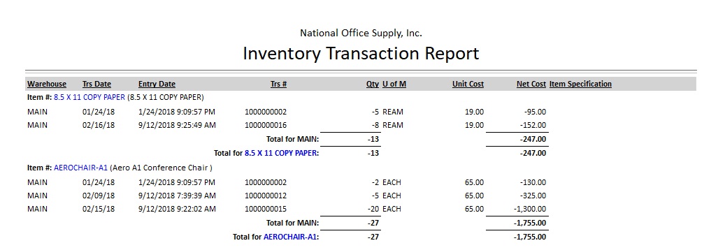You can generate the report show either transaction amount or transaction quantity. You can further opt to generate the report exclusively for one of the following transaction types: invoice transactions, received goods transactions, inventory adjustments, internal stock issuances, kit transactions, cost method change, physical count updates, standard cost updates, finished job transactions for parent item, or finished job transactions for component items.