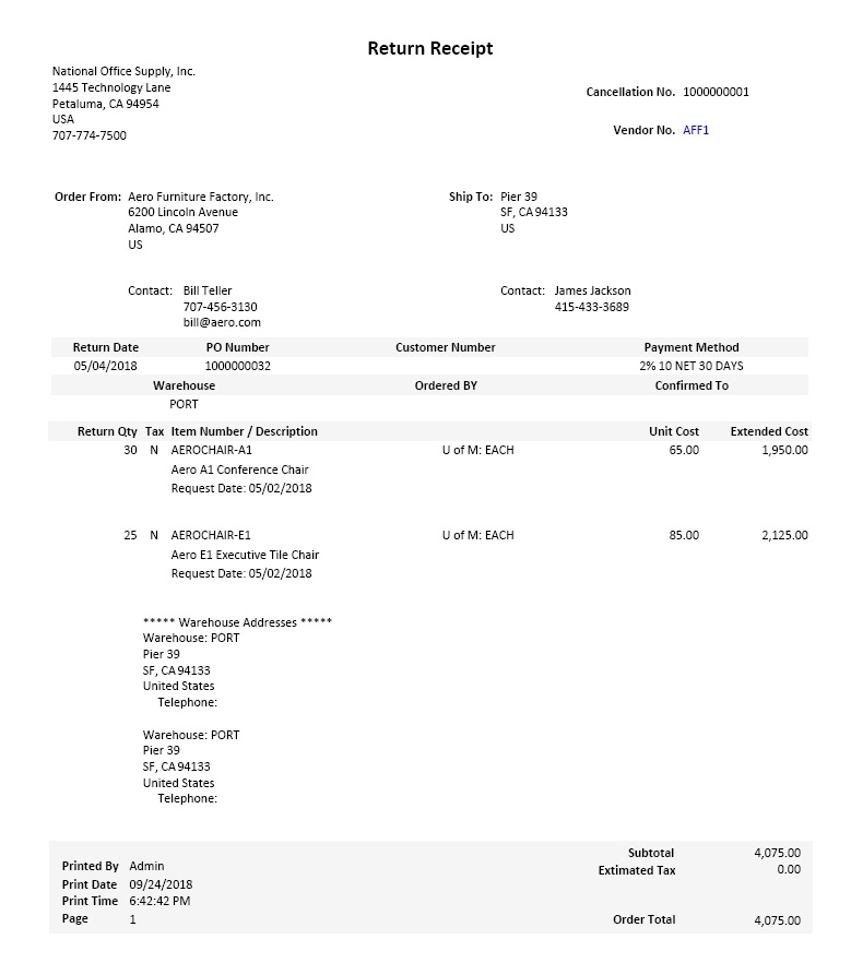 The Print Return Receipt function allows you to print Return Receipt documents that support the cancelled PO receipts.