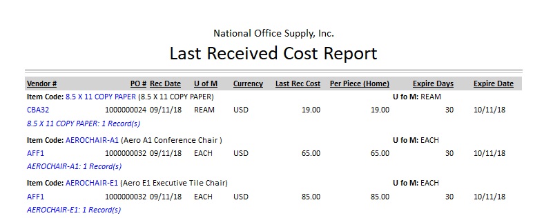 The Last Received Cost Report provides information on each PO line item price that is based upon its last purchase cost. This information includes each inventory item’s last purchase price, the related purchase order number, and the number of days the purchase price remains effective. This report is useful in determining the latest purchase cost of inventory items and the duration that price will be in effect.