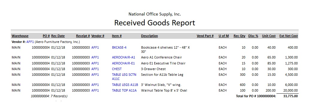 The Received Goods Report provides information on inventory items that are recorded as received from vendors using the Receive Goods function. This report is useful in reviewing the order receipt details including the unit costs, discounts that are taken advantage of, quantities received, among other pertinent information.