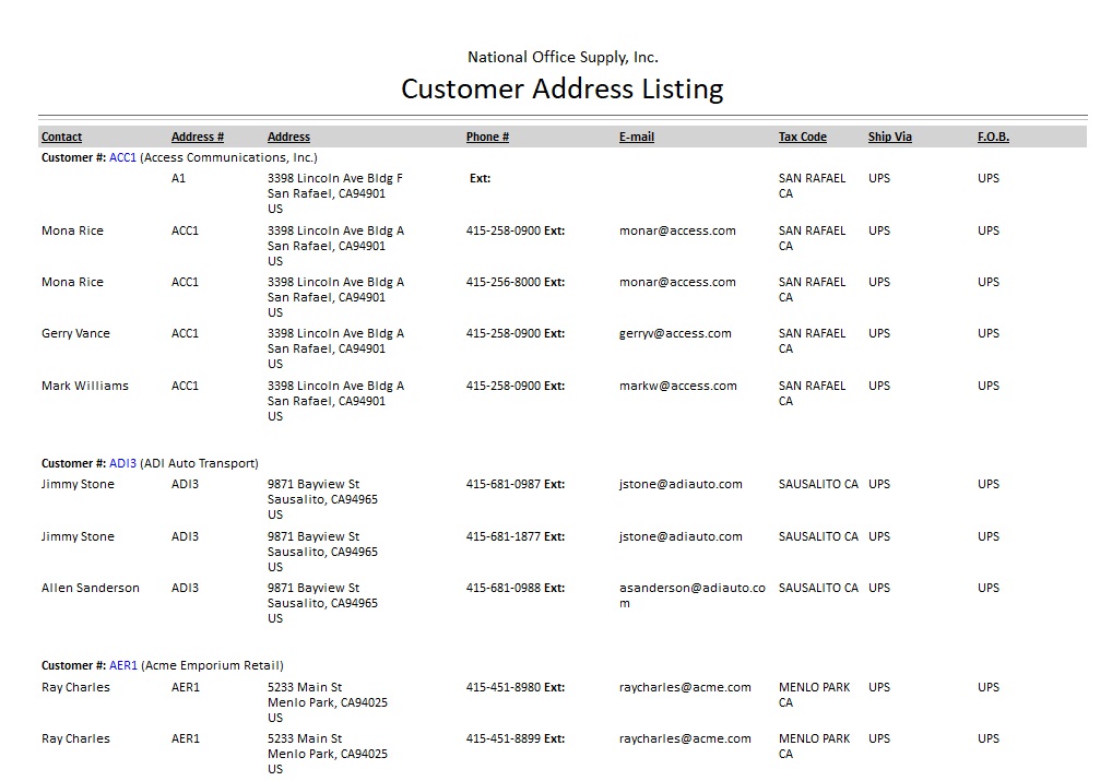 The Customer Address Listing shows supplemental addresses of customers with offices or warehouses in multiple locations. This report supplements the Customer Listing report.