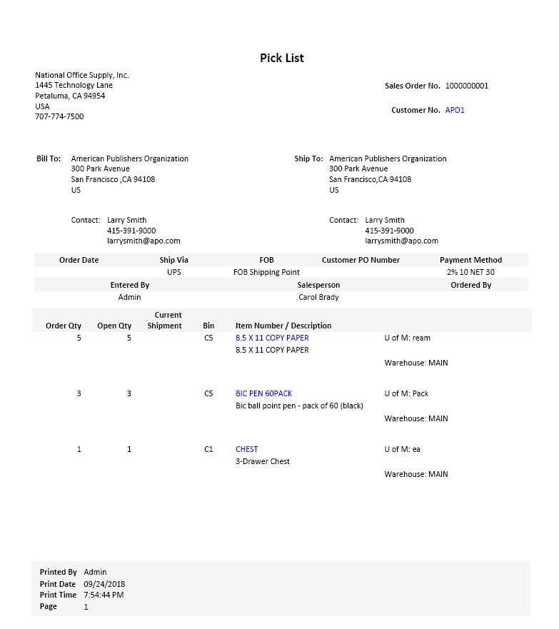 Warehouse personnel uses a Pick List as a check list for all inventory items that will be packed and shipped to your customers. The Print Pick List function allows you to print and preview Pick Lists, which are useful for identifying and locating inventory items that will be included in the shipment.