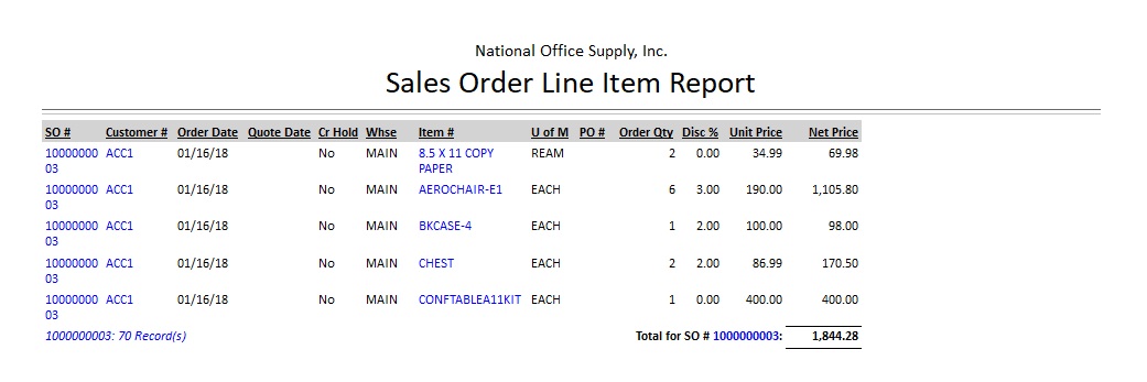 The Sales Order Line Item Report provides detailed information on each sales order or sales quote line items including the sales order numbers, customer numbers, order dates and source warehouses as well as the inventory items’ numbers, units of measurement, order quantities, unit prices, discount rates, and net prices. This report is useful in reviewing the accuracy of sales order or quote information and in determining the inventory items that are saleable during a specified period.