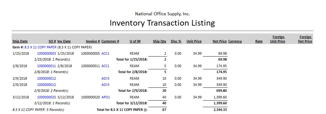 The Inventory Transaction Listing shows the details of inventory item transactions that are recorded in the Sales Order or Accounts Receivable module. This report lists all the inventory item transactions within a specific date range based on the order date, ship date, and/or invoice date. This report is useful for monitoring, reviewing and analyzing sales of the inventory items.