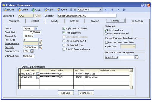 Customer Ledger Card—Drill down information displays details of a customer’s sales invoices and the related payment information, credit invoices, invoice line item distribution, finance charges, taxes, freight and customer deposits. ![]() Customer Maintenance—Settings Tab