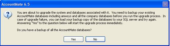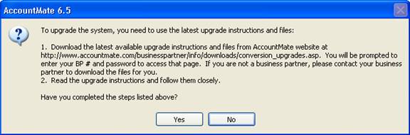 The next screen (Figure 2) is a reminder to download the latest version of the update scripts and instructions from the Conversion and Upgrades section of the AccountMate website. If you have already performed these steps, click on Yes to proceed to the next screen.