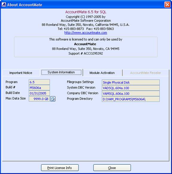 One way of verifying that you have successfully completed the update is by checking the information contained in the Help/About AccountMate 6.5 for SQL/MSDE window. Check that the Build#, System DBC Version and Company DBC Version are as shown in Figure 5. The Program Directory will not necessarily change since this is just the directory/path where the AccountMate 6.5 for SQL/MSDE front end is installed.