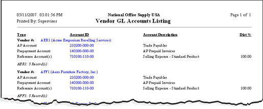 The Vendor GL Accounts Listing shows information on the default GL Account IDs used for each vendor's transactions. This report is useful for reviewing and updating the default GL Account IDs assigned to each vendor record.