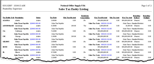 The Sales Tax Code Listing provides detailed information on the sales tax codes set up through the Sales Tax Code Maintenance function. This report is useful for reviewing the accuracy of the sales tax codes and for validating their associated sales tax entities and rates.
