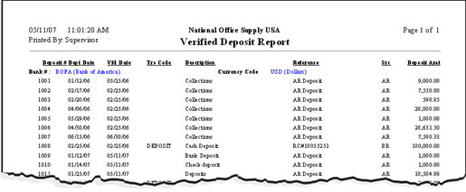 The Verified Deposit Report provides detailed information on the deposits that have cleared the bank. It shows the deposit number and date, verified date, transaction code, description, reference, source module and deposit amount. You may use the report to verify the actual clearing time of these deposits for each bank. By properly monitoring the clearing of deposits in these bank accounts, it allows you to better manage your cash disbursements or check issuances. This report is also useful for reconciling bank deposits.