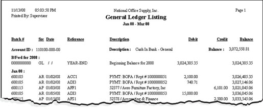 The General Ledger Listing provides detailed information on activity and balances in each of your posting GL Account IDs. It provides details of the debit and credit amounts per transaction posted to each GL Account ID. The transactions listed in this report may come from the General Ledger module or may be transferred from the subsidiary modules. This report is useful for reviewing and verifying transactions entered in the General Ledger, and as reference in reconciling balances shown in your Trial Balance.