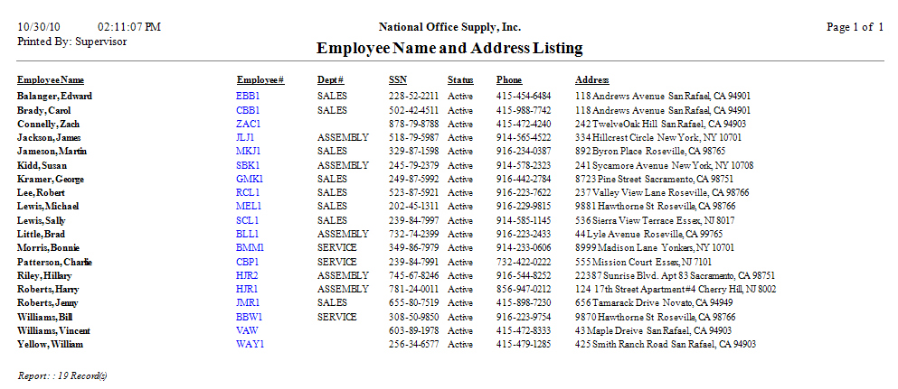 The employee's and independent contractor's names, social security numbers, phone numbers and addresses as well as status (active, inactive, or terminated) are all shown in the Employee Name and Address Listing. This report is most useful when you need personal data and contact information of a certain employee or independent contractor. You can generate this report for active, inactive, terminated, or all employees