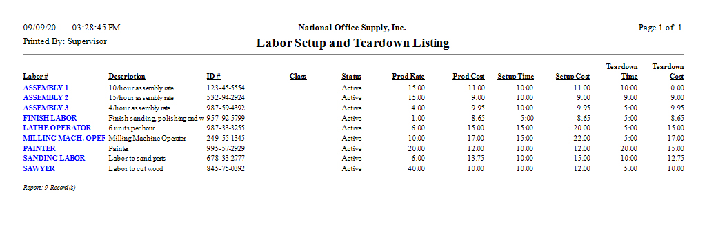 The Labor Reports provide information about the labor components particularly the list of labor setup and teardown time as well as the labor usage details. Each of the Labor Reports has various options and criteria that provide a wide variety of labor component-related information and report formats. Read the information below to get a closer look at each of the Labor Reports available in AccountMate. Labor Setup and Teardown Listing The Labor Setup and Teardown Listing provides information on the default labor setup and teardown times, units processed per hour, and the associated costs for each labor resource, all of which are taken from the labor records. This report lists the labor component numbers and descriptions, ID numbers, classes, status, production rates, production costs, setup time and costs as well as teardown time and costs. You can use this report in analyzing the costs and other relevant information pertaining to the various labor resources used during the manufacturing process. It also serves as a guide in reviewing the accuracy of details in the labor records. You can opt to include in the report only the active labor resources, only the inactive labor resources, or all labor resources regardless of their status. ![]() Labor Usage Report The Labor Usage Report provides information on the usage of labor resources. This report lists the labor component numbers and descriptions, ID numbers, classes, status, worked time, and allocated time for each labor resource used during the manufacturing process. You can refer to this report when determining the worked time and allocated time for labor resources and when analyzing the usage of various labor resources. You may include in the report only the active labor resources, only the inactive labor resources, or all labor resources regardless of their status. ![]() |