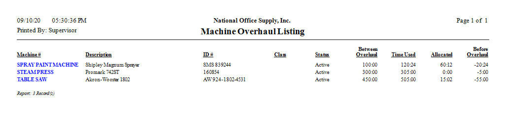The Machine Reports provide information about the machine components particularly the machine setup and teardown time lists as well as the machine usage and overhaul details. Each of the Machine Reports has various options and criteria that provide a wide variety of machine component-related information and report formats. Read the information below to get a closer look at each of the Machine Reports available in AccountMate. Machine Setup and Teardown Listing The Machine Setup and Teardown Listing provides information on the default setup and teardown times, units processed per hour, and the associated costs for each machine, all of which are taken from the machine records. This report lists the machine component numbers and descriptions, ID numbers, classes, status, production rates, machine costs, setup time and costs as well as teardown time and costs. You can use this report in analyzing the costs and other relevant information pertaining to the various machines used during the manufacturing process. It also serves as a guide in reviewing the accuracy of details in the machine records. You can opt to include in the report only the active machines, only the inactive machines, or all machines regardless of their status. ![]() Machine Usage Report The Machine Usage Report provides information on the usage and availability of machine resources. This report lists the machine component numbers and descriptions, ID numbers, classes, status, time between overhaul, time used, allocated time, and time before the next scheduled overhaul. You can refer to this report when determining the machine resources availability prior to the next scheduled overhaul and when analyzing the usage of various machine resources. You may include in the report only the active machines, only the inactive machines, or all machines regardless of their status. ![]() Machine Overhaul Listing Similar to the Machine Usage Report, the Machine Overhaul Listing provides a list of the machine usage and availability; however, the latter includes only the machines which usage has exceeded the time between overhauls. This report lists the machine component numbers and descriptions, ID numbers, classes, status, time between overhaul, time used, allocated time, and time before the next scheduled overhaul. You can generate this report to obtain a list of machines that exceed the overhaul point. You may include in the report only the active machines, only the inactive machines, or all machines regardless of their status.