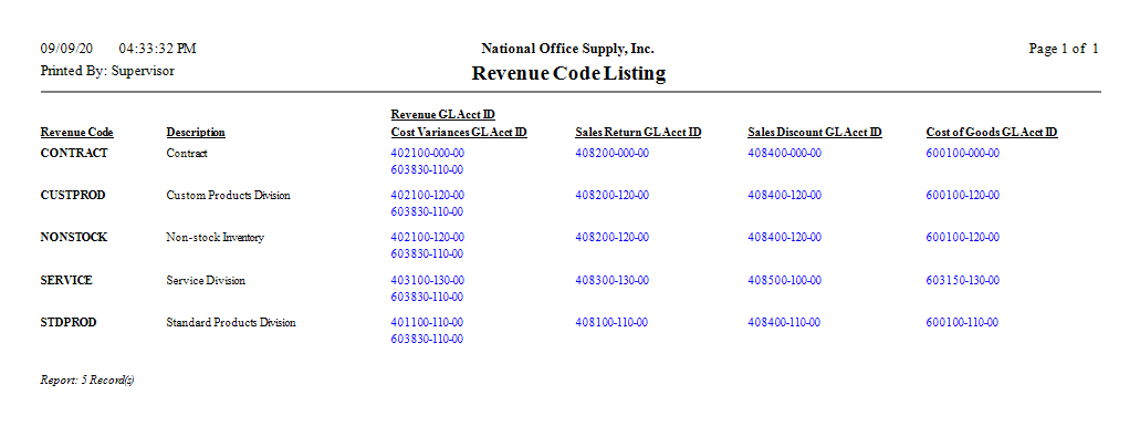 The Revenue Code Listing provides detailed information on the revenue codes including the assigned GL Account IDs for recording sales, sales returns, sales discounts, and cost of goods sold. Revenue codes are set up using the Revenue Code Maintenance function. This report is useful for reviewing the completeness of the revenue code records and for validating the GL Account IDs assigned to each revenue code. ![]() |