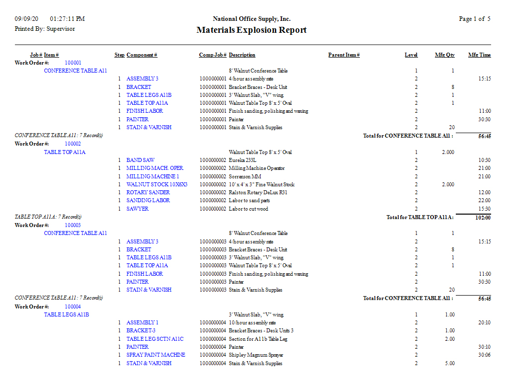 The Work Order Reports provide information on the work order status, backorders, unexploded work orders, component explosions, and where specific components have been used. Each of the Work Order Reports has various options and criteria that provide a wide variety of work order-related information and report formats. Read the information below to get a closer look at each of the Work Order Reports available in AccountMate. Work Order Status Report The Work Order Status Report provides information on the work orders' status and balances. The report shows the inventory item quantities that are yet to be manufactured, in-process, and/or finished products. More specifically, this report shows the work order numbers, job numbers, parent item numbers and descriptions, work order dates, request dates, manufacturing quantities, work-in-process quantities, finished quantities, standard costs, and extended costs. You can use this report as reference in managing the production resources and prioritizing the work order completion. You can generate this report only for master parent jobs, only for subassembly jobs, or all jobs. You can further filter the report to include only the completed jobs, only the incomplete jobs, or all jobs regardless of their status. ![]() Backorder Report The Backorder Report provides detail information of work order line items that are on back order (e.g., work order line items that are yet to be manufactured). This report includes specific information including the work order numbers, job numbers, parent item numbers and descriptions, work order dates, request dates, manufacturing quantities, finished quantities, work-in-process quantities, backorder quantities, standard costs, and backorder extended costs pertaining to the backorder items. This report is useful in managing the backorders and production resources as well as in prioritizing the work order completion. You can opt to count the work-in-process quantities as backorder quantities. You can generate this report only for master parent jobs, only for subassembly jobs, or all jobs. You can further filter the report to include only the completed jobs, only the incomplete jobs, or all jobs regardless of their status. ![]() Unexploded Work Report The Unexploded Work Report provides information on work orders that are yet to be exploded into their jobs and components. More specifically, this report includes information on the work order numbers, parent item numbers and descriptions, work order dates, request dates, and manufacturing quantities pertaining to the unexploded work orders. This report helps you identify and review the work orders that are yet to be exploded as well as manage resources and prioritize the work order explosion. ![]() Materials Explosion Report The Materials Explosion Report provides information on work orders that have been exploded into their jobs and components. More specifically, this report includes information on the work order numbers, item numbers and descriptions, component item numbers and descriptions, completed job numbers, manufacturing levels, manufacturing quantities, and manufacturing time pertaining to the exploded work orders. This report helps you determine the components used in each job as well as the explosion level of each job and its components. It is also useful in determining the master item job to which the parent item is assigned as well as the inventory item quantities, machine resources, and labor resources needed to manufacture the parent item. You can generate this report only for the completed jobs, only for the incomplete jobs, or for all jobs regardless of their status. ![]() Where-Used Report The Where-Used Report provides information on the usage of the master item components--inventory items, labor resources and/or machine resources--to complete a job. This report lists for each component the related work orders and jobs to which the component is required. In addition, the report shows the quantities needed to manufacture a master or parent item as well as the work-in-process, allocated, finished, and used quantities of each component in every job. The report shows for each labor or machine resource the setup time, teardown time, manufacturing time, allocated time, and the time used for each component in every job. You can refer to this report when monitoring the resources usage during production.
