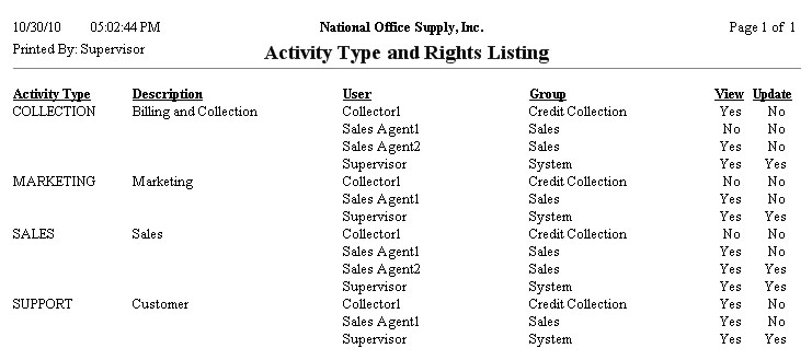 The Activity Reports allow you to generate reports that provide information about the types of activities and activity rights set up in AccountMate. It also provides information on customers’ activities. Each of the Activity Reports is especially designed to provide several options so you can narrow down data to the specific information needed. Read the information below to get a closer look at each of the Activity Reports available in AccountMate. Activity Type and Rights Listing If you want to view the list of activity types and activity rights records set up in AccountMate, generate the Activity Type and Rights Listing. This report provides a quick view of the nature of your company’s activities and processes (i.e., customer complaints, contract negotiation, etc.) in the course of transacting with your customers. This report also helps you identify which users have the rights to view/update a certain activity type. You can generate the report showing only the activity types.